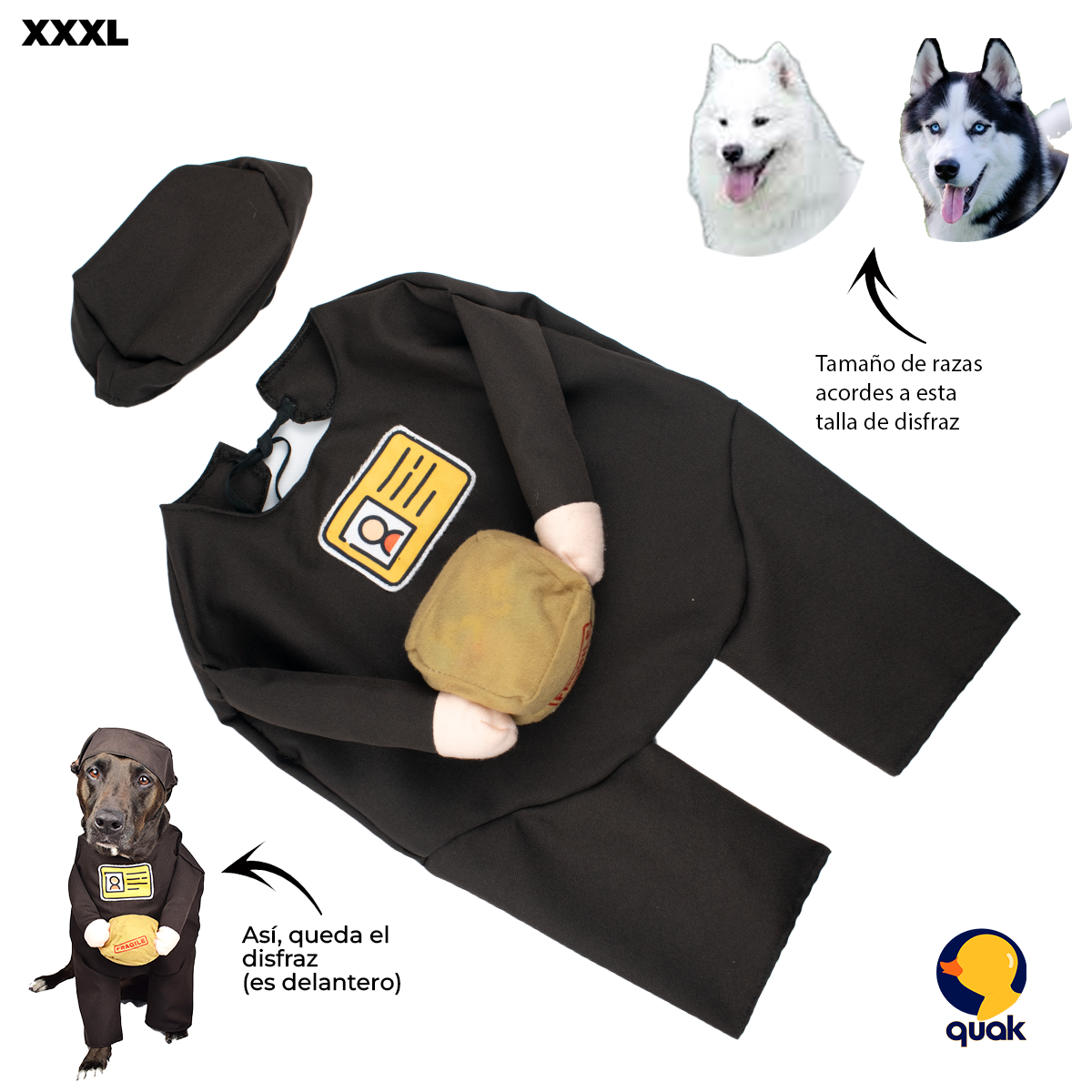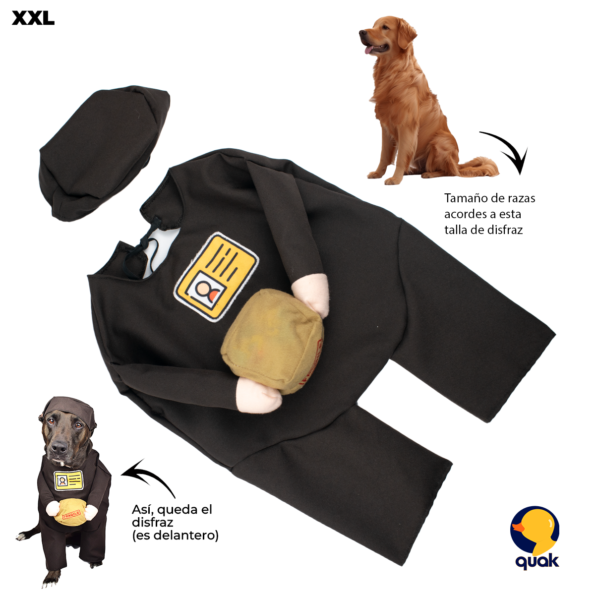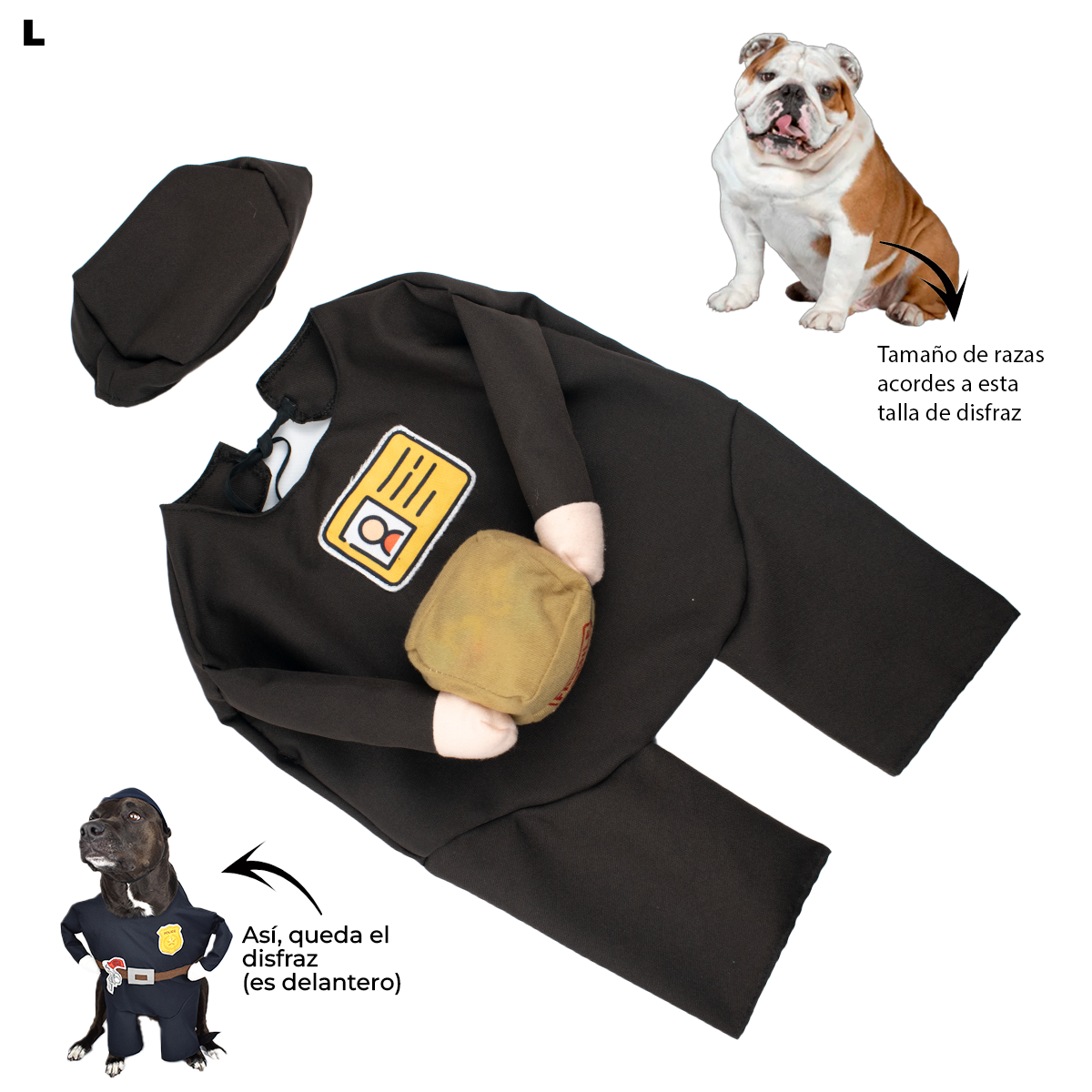 Este disfraz para perros de mensajero está disponible en diferentes tallas (desde S hasta XL), adaptándose a razas pequeñas, medianas y grandes como Shih Tzu, Pug, French Bulldog, Beagle o Border Collie. REVISA LA TABLA DE MEDIDAS ANTES DE REALIZAR LA COMPRA